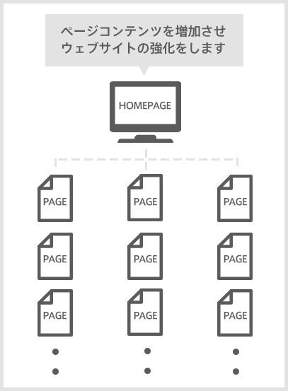 コンテンツ制作には、費用がかかりますが、確実に御社のウェブサイトのページ数を増やしていくことで、新たなキーワードでの流入アップを行います。